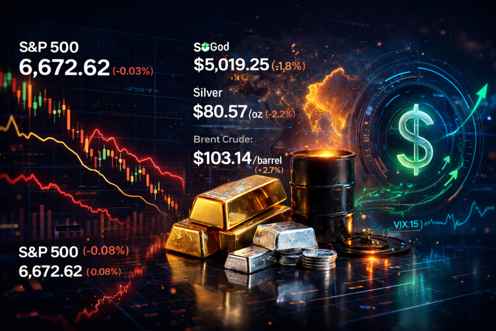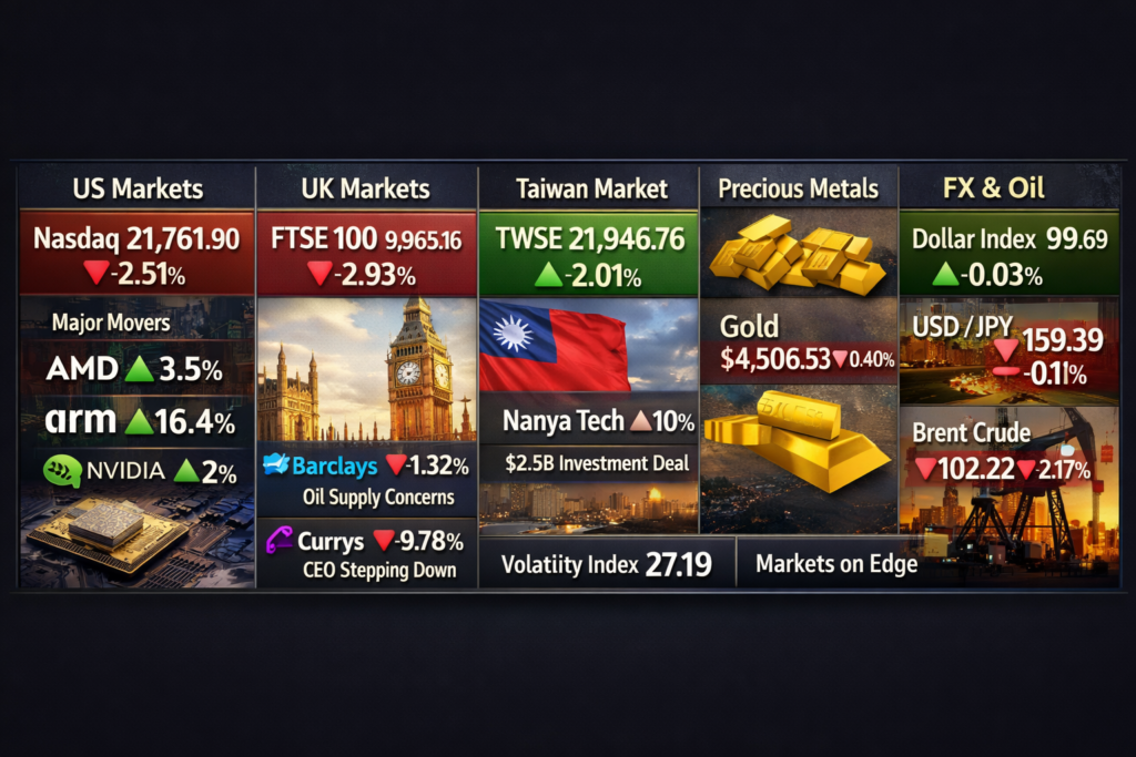 War triggers Brent crude near $102/bbl, Currys sinks 9.78% on CEO departure, silver drops 1.9% Broad market weakness emerges as elevated oil prices above $100 fuel inflation concerns, pushing the Nasdaq down 2.51% and the FTSE 100 lower by 2.93%, while precious metals soften with gold slipping 0.40% and silver increasing 0.40%, reflecting cautious sentiment […]
