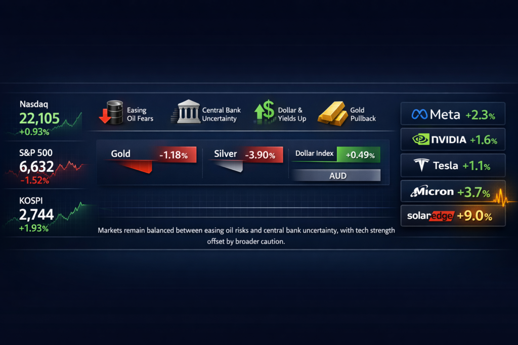 Markets stayed on edge as easing oil fears collided with central bank uncertainty. Global markets were mixed ahead of key central bank decisions, with the Nasdaq rising 0.93% supported by strength in tech stocks such as Meta (+2.3%), while the S&P 500 fell 1.52% reflecting broader caution. Asian equities gained, led by Korea (+1.93%), as […]