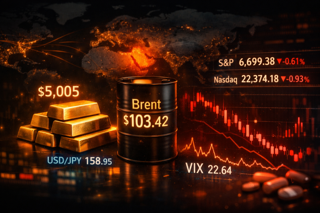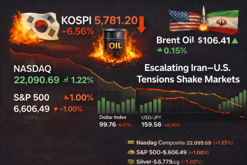 Risk sentiment turns sharply cautious as escalating war risks and energy infrastructure threats drive a global shift into safe-haven assets. Global markets turned risk-off as KOSPI plunged over 6% and oil held above $106/bbl. amid escalating Iran–U.S. tensions and threats to energy infrastructure. Equities were mixed, with the Nasdaq up 1.2% on tech buying while the […]