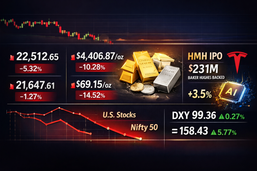 HDFC issues; gold and silver retreat amid rising yields. Global markets fell sharply, with equities under pressure as yields rose and geopolitical tensions escalated. The Nifty dropped over 5% while U.S. stocks declined more than 1%, led by weakness in growth sectors. Commodities saw heavy selling, with gold and silver plunging on dollar strength and […]