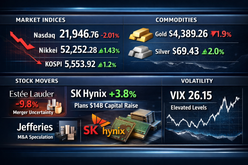 Investors stayed cautious as Estee Lauder fell 9.8% on merger uncertainty, gold dropped 1.9% on higher yields. Markets traded with a cautious tone as investors reacted to rising rate expectations and key corporate developments. U.S. equities declined, with the Nasdaq falling 2.01%, while Asian markets outperformed, led by the Nikkei (+1.43%) and KOSPI (+1.2%). In […]