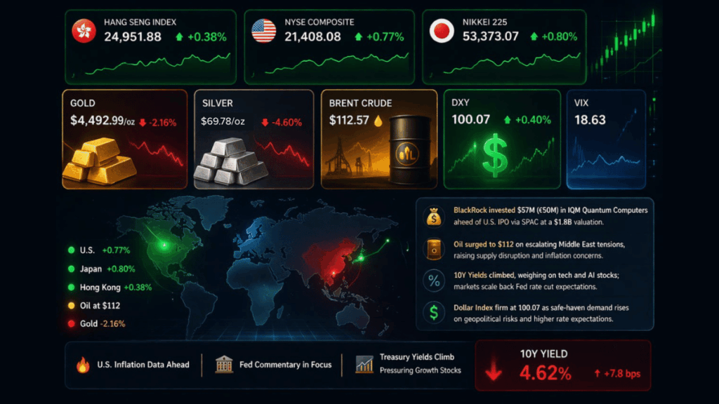 Rising yields, $112 oil, and a firmer dollar at 100+ weigh on risk sentiment. Global markets were pressured with tech and AI names, while oil surged to $112.bbl. on Middle East risks reinforcing higher-for-longer rate expectations’. equities +0.77% were supported by financials, but growth lagged, while Nikkei +0.80% outperformed on energy strength and Hang Seng +0.38% saw rotation out of tech. Today’s […]