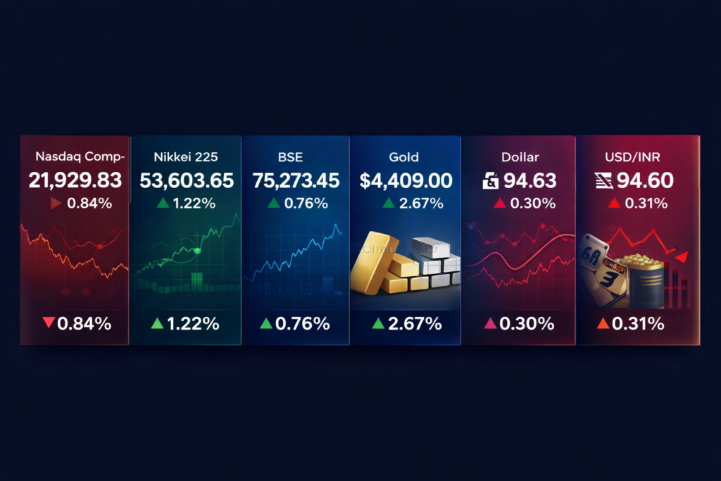 Gold and silver rebound as weaker dollar and safe-haven demand return Global markets traded cautiously as rising U.S. Treasury yields pressured equity valuations, with the Nasdaq falling 0.84%. Asian markets diverged, as the Nikkei gained 1.22% while the BSE rose 0.76%. Commodities rebounded, with gold up 2.67% and silver gaining 2.62% amid a softer dollar. In FX, the dollar index edged up 0.30% while USD/INR […]