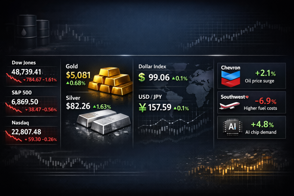 Stocks Slide Amid Rising Market Uncertainty as Gold, Silver and AI Shares Climb Global markets turned cautious as Middle East tensions pushed oil up nearly 5%, reviving inflation concerns. U.S. stocks fell, with the Dow down 1.61%, the S&P 500 −0.56%, and Nasdaq 0.26%, while the VIX rose to 23.57. Safe-haven demand lifted gold (+0.68%) […]