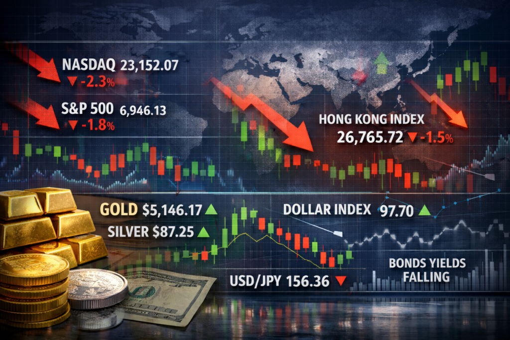 Investors turned more defensive as mega-cap weakness pulled U.S. and Asian equities off recent highs. Global equities retreated from prior closes after Nvidia’s 5.5% drop pressured AI-linked positioning. The Nasdaq fell from 22,878, and the S&P 500 from 6,908.86. Gold was trading at 5,185.29/oz. The dollar firmed from 97.70, and USD/JPY softened from 156.36. Today’s […]