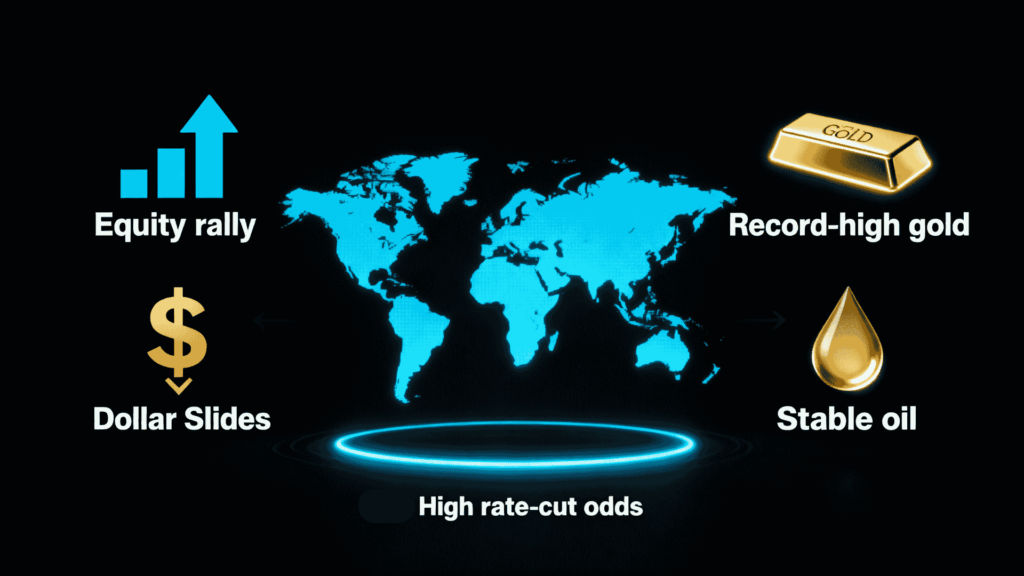 Global equities trade near all-time highs as markets price an 85–90% chance of a Federal Reserve rate cut this week; U.S. indices edge up, European stocks hold recent gains, Asia trades cautiously higher, the dollar lingers near multi-week lows, VIX stays subdued, Brent holds above $63, and gold remains close to record territory. Market Note: […]